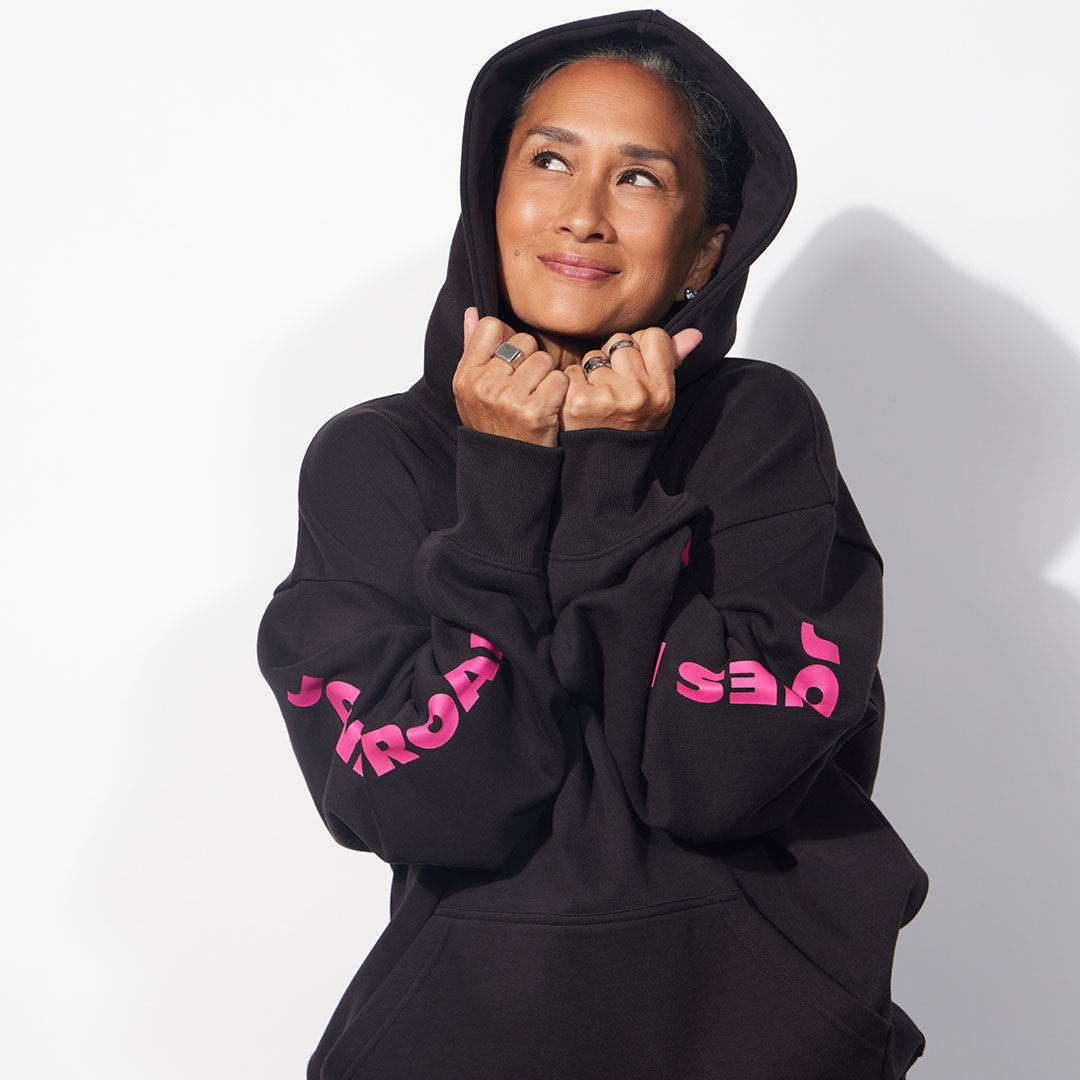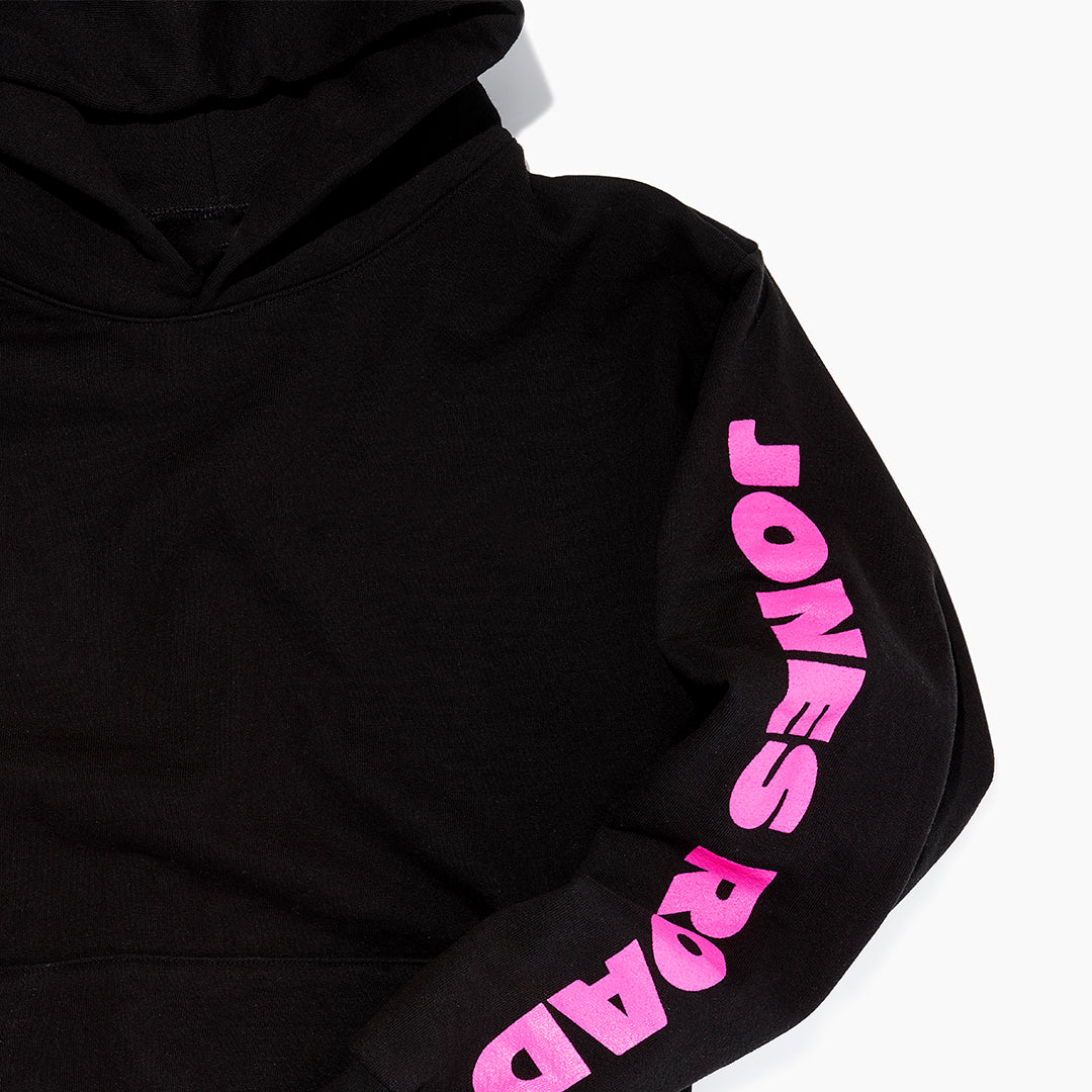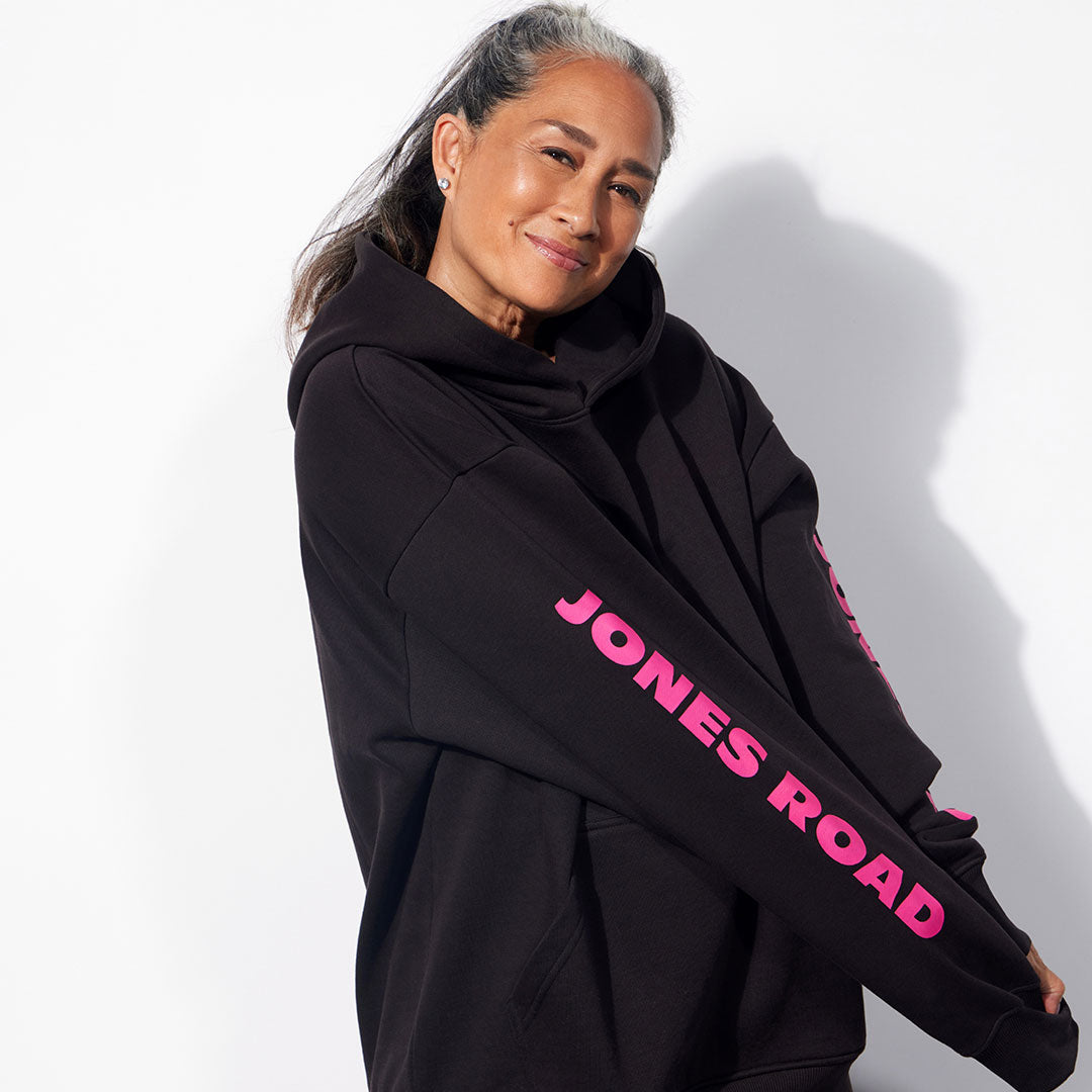 Our first hoodie - and a Jones Road office favorite. Oversized with a plush and cozy interior. Available in Black/Pink and Bone/Black options. Made of 90% Cotton, 10% Polyester.