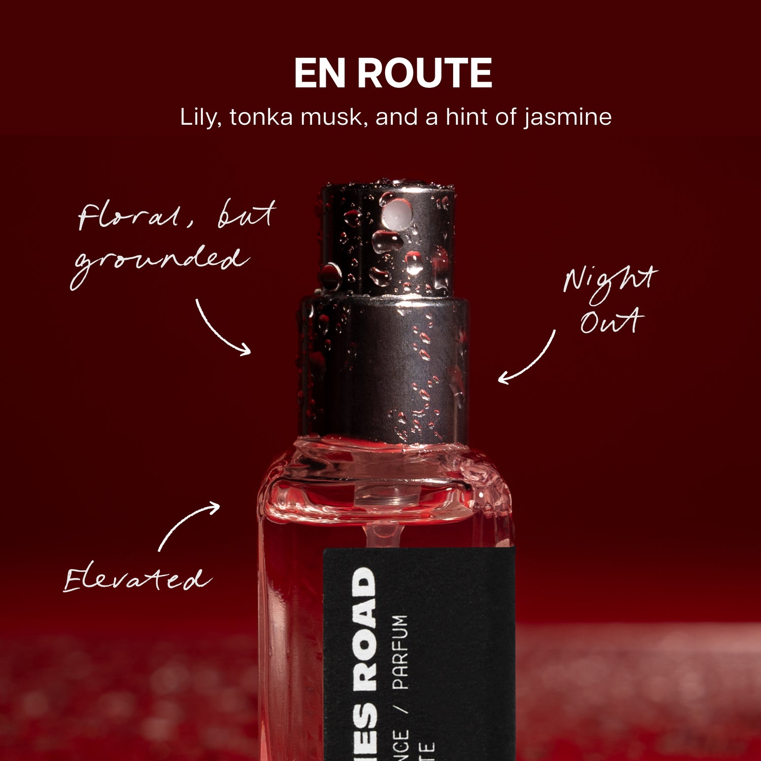 En Route is an evening fragrance that captures those romantic, buzzy moments leading up to something great. With notes of lily, tonka musk, and a hint of jasmine, this is a scent that’s elevated, exciting, and a little unexpected. It’s subtly floral, yet grounded. Soft, but memorable — just like the best nights are.