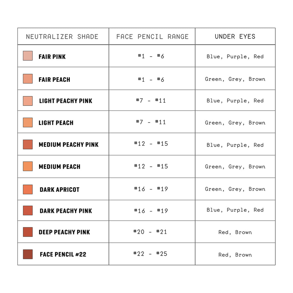 Neutralizers and color correctors are the same. They both brighten and color correct darkness around the eyes and along the face. They are peachy or pinky in hue, and therefore should be followed up with a layer of The Face Pencil to even complexion.