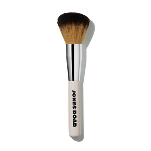 Dip The Face Powder Brush into the powder and tap it against your hand or a table to remove any excess powder. Apply to set your complexion products, color correct, or over areas you want to take down oil and shine like the forehead, nose, and chin.