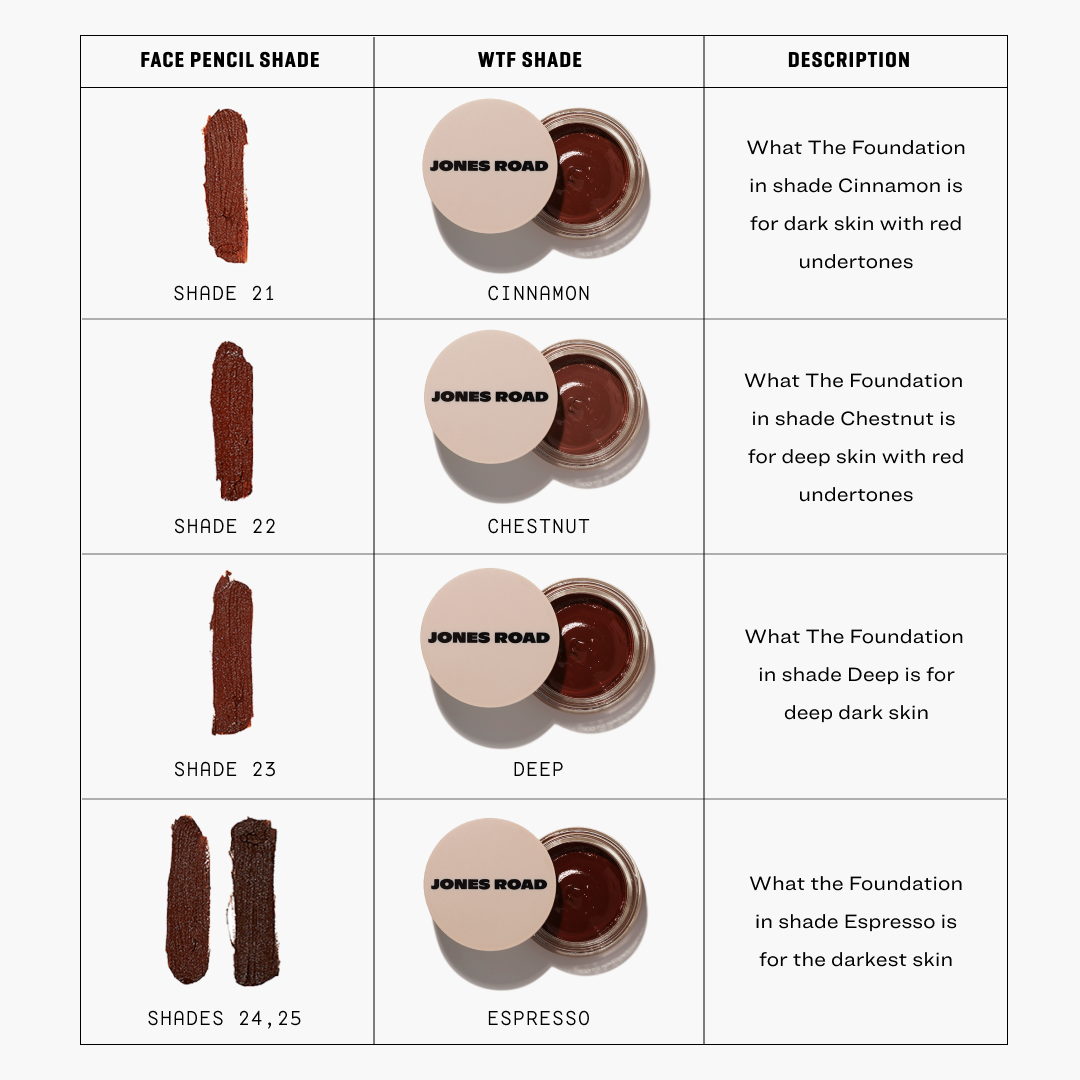 What The Foundation is our take on a foundation, offering light-medium, buildable coverage. Its ultra-nourishing formula blends seamlessly into the skin, leaving you with an even, fresh complexion that looks like your skin on its best day. WTF works flawlessly with The Face Pencil for added coverage in areas with extra redness, blemishes or discoloration.